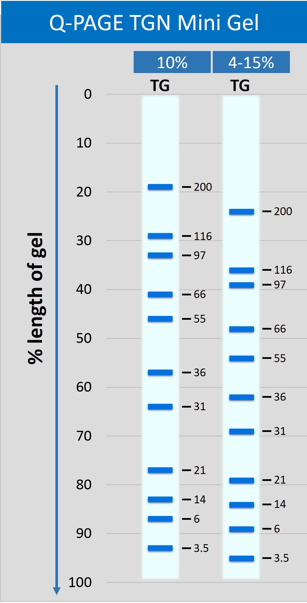 Q-PAGE™ TGN (Tris-Glycine Novel) Precast Gels are ready-to-use acrylamide gels for SDS-PAGE running in Tris-Glycine buffer system. With unique formula, Q-PAGE™ TGN Precast Gels perform enhanced speed, better separation, and longer shelf life as compared with conventional Laemmli Tris-HCl gels. The protein migration patterns in Q-PAGE™ TGN series, however, are similar with typical Laemmli Tris-HCl gels, and thus Q-PAGE™ TGN Precast Gels are compatible to traditional SDS-PAGE and subsequent analyses.