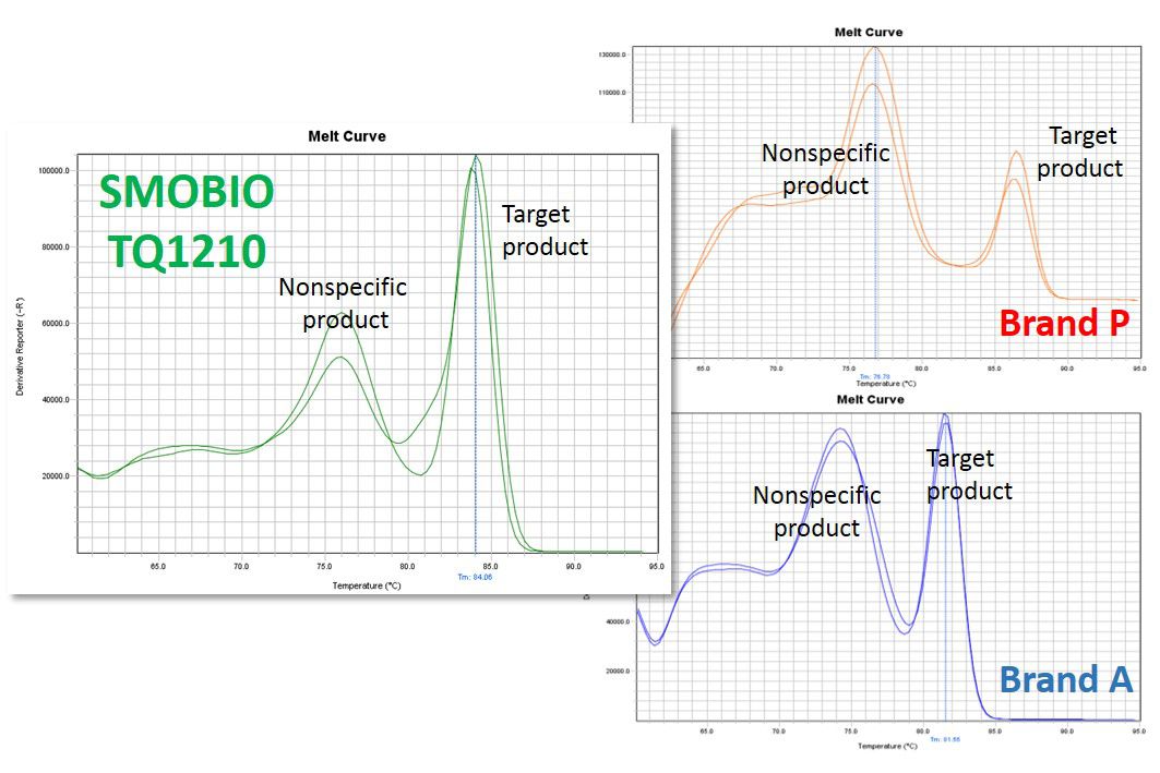 The post-amplification melt-curve analyzed with relatively higher concentration of primers (400 nM) reveals the specificity of qPCR reagents. The multiple peaks of melt curve display a nonspecific and a target PCR products. The ratio of nonspecific PCR product to target PCR product represents the specificity of qPCR reagents. The ratio analyzed using TQ1210 (0.5 to 1) was lower than the ratio analyzed from brand P (2 to 1) and A (0.8 to 1), showing high specificity of TQ1210.